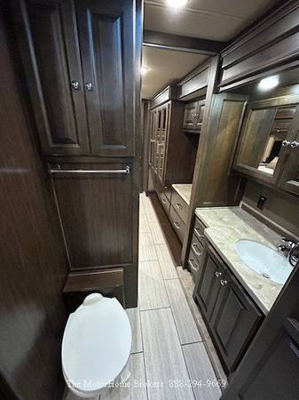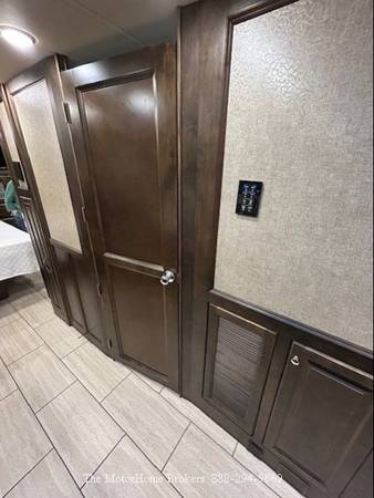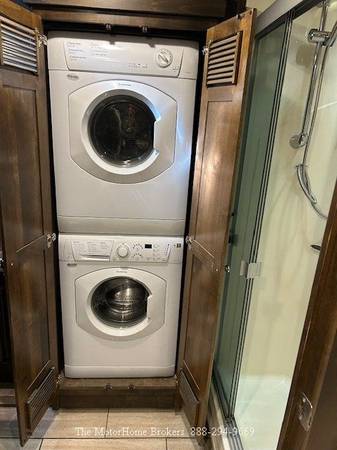 This layout offers a unique private bathroom with dual entries, an over-sized glass enclosed shower with a seat, china toilet, a nice vanity sink with storage drawers, medicine cabinet and a cabinet with a stacked washer and dryer. NICE ! The master bedroom suite has 2 more slide-outs, a King Bed, a large wardrobe, chest of drawers, LED TV, ceiling fan, central vacuum and so much more.