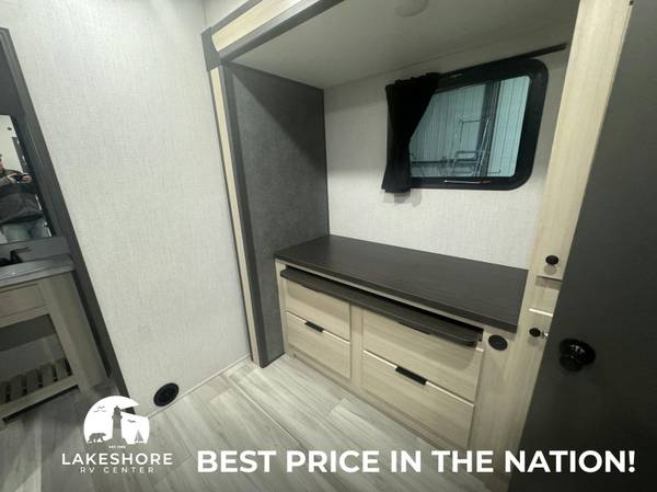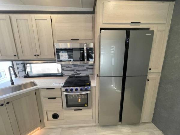 With two full baths, a master bunkhouse/office, and two entry doors, this fifth is a dream! The front bedroom includes a king bed slide out, dresser, and front walk-in wardrobe with washer and dryer prep. And there is a full bath close by for easy access. The rear bunkhouse includes triple bunks, dual opposing slides, a pull-out desktop, and a full rear bath with its own exterior entry door for convenience. In the morning, everyone can meet in the middle kitchen and living room while the chef prepares breakfast with the 21" 2-in-1 oven. There is a hi-top table and chairs for dining, theater seating for relaxing, plus a pantry and 16 cu. ft. 12V refrigerator for food storage.