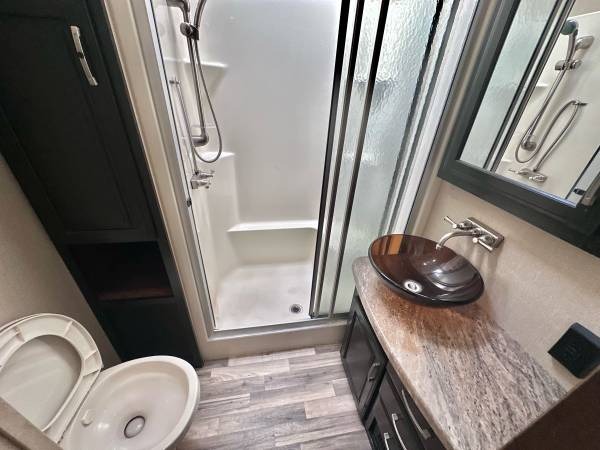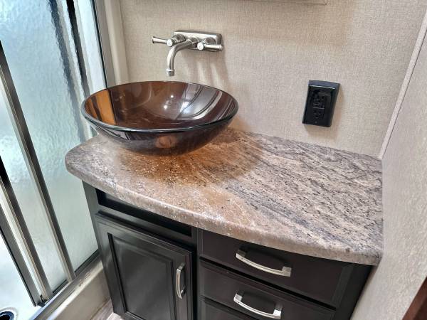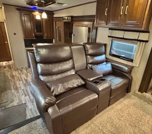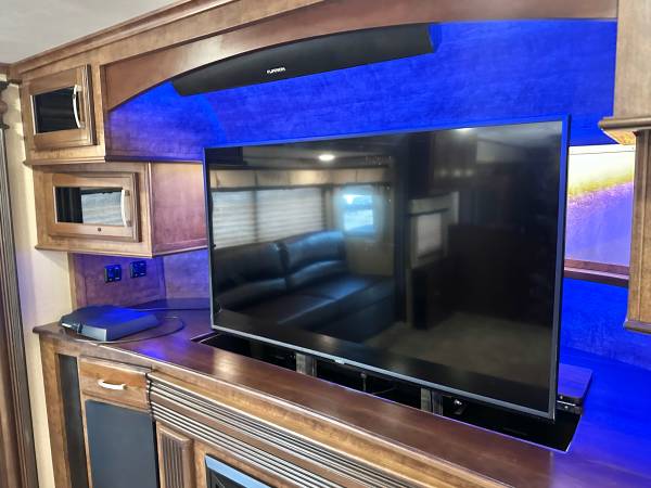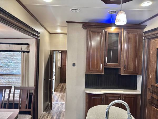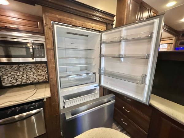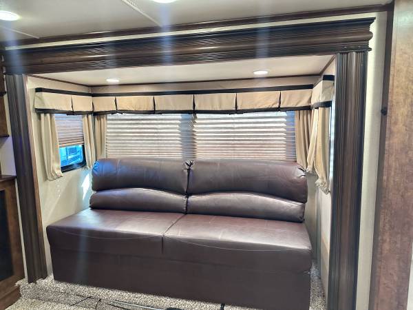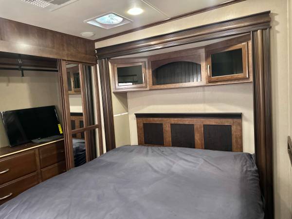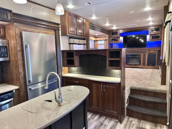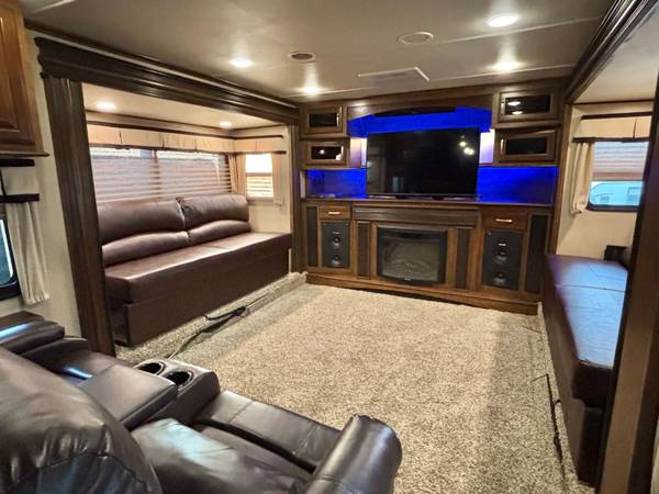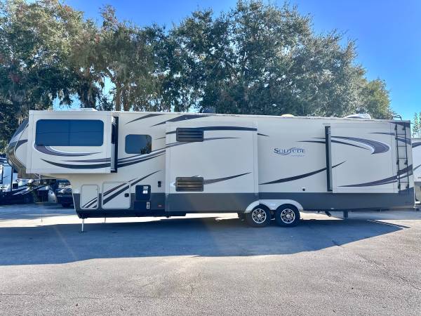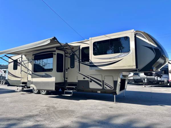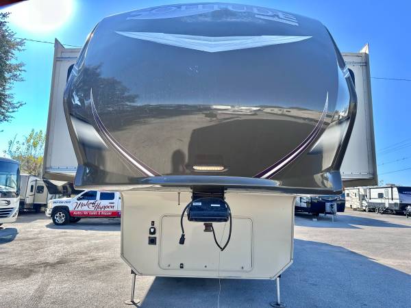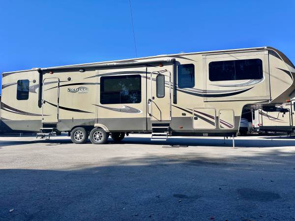 2016 Grand Design Solitude Series M-379FL, 5 slides, 2 entry doors, auto-leveling jacks, 2 air conditioning unit’s, large power awning, inside has a front living floorplan, sleeps up to 6 people, rear bedroom has queen bed, walk-in closet, washer/dryer hookup, large full bathroom with tall cielings, large kitchen with island, corian countertops, new residential refrigerator, 3 burner stove with oven, stainless steel sink, microwave, dining table for 4, front living area with 2 new jackknife couches, large flatscreen tv, fireplace, Bluetooth furrion system, very clean interior, 42’6” total length, 13,800 lbs dry weight, priced to sell only $34,900 we finance, take trade-in’s, and deliver, call 863-450-2959!