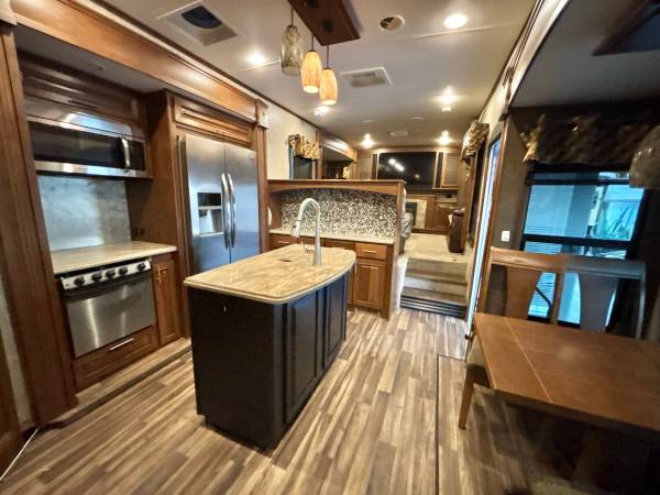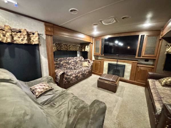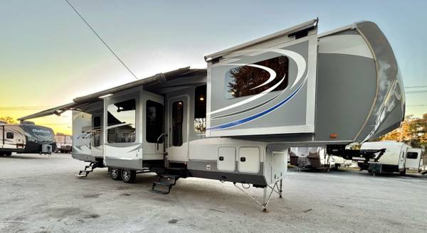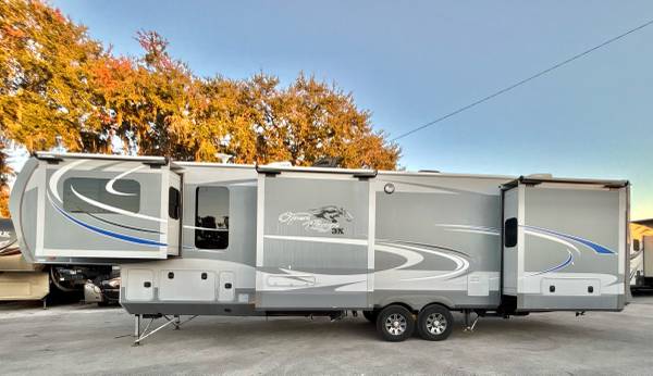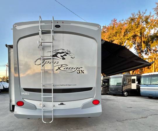 2016 Highland Ridge Open Range 3X M-377FLR, front living floor plan, 5 slide-out’s, 2 air conditioning units, auto-leveling system, pass through storage compartment, 2 power awning’s, slide topper awning’s, 2 entry doors, inside sleeps 6, fireplace, Bluetooth soundbar, large Tv, very nice kitchen, corian countertops, large pantry, residential refrigerator, 3 burner stove with oven, microwave, large stainless steel sink, bathroom has high ceilings, stand up shower, master has washer and dryer hook up, queen bed, closet slide-out, 40’total length, 12,860 lbs dry weight, 10 gallon water heater only $24,900 we finance, deliver and take trade-in’s, call 863-450-2959!