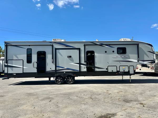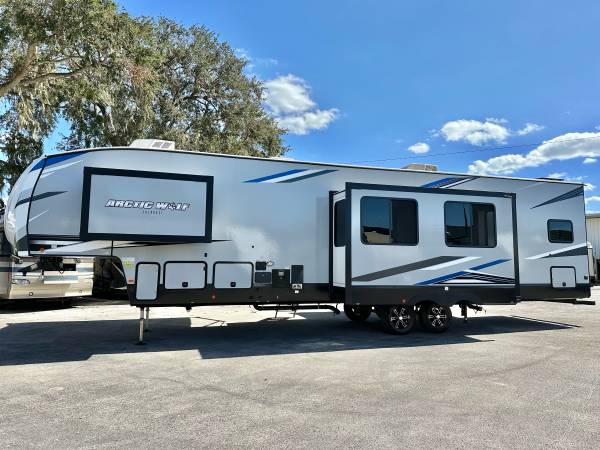 2022 Cherokee by Forest River Arctic Wolf M-3770SUITE, 2 bedroom 1 1/2 bath floorplan, 3 slide-out’s, 2 air conditioning units, 4 seasons package, auto-leveling jacks, all aluminum construction, full outdoor kitchen, 2 entry doors, 2 large power awnings, 16 ply tires, pass through storage compartment, 2 propane tanks, inside sleeps up to 6 people, master has king size bed, washer/dryer hookup, large full bathroom with glass door shower, large living room, kitchen island, large electric refrigerator, microwave, 3 burner stove with oven, rear bunkroom has queen size loft, 1/2 bathroom, 43’6” total length, 10,893 lbs dry weight, 50 amp service, only $34900 we Finance, take trade-in’s, and Deliver, call 863-450-2959!