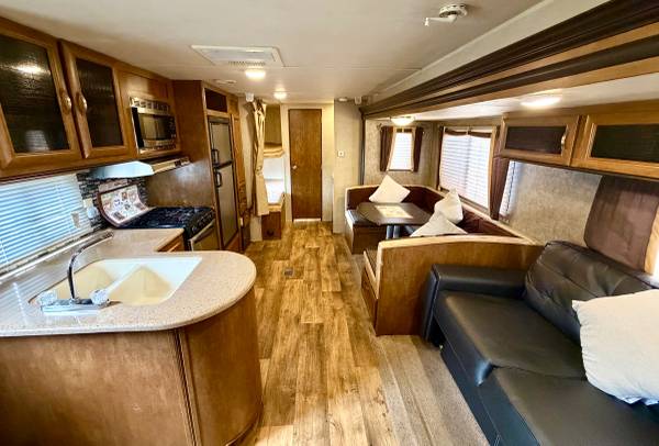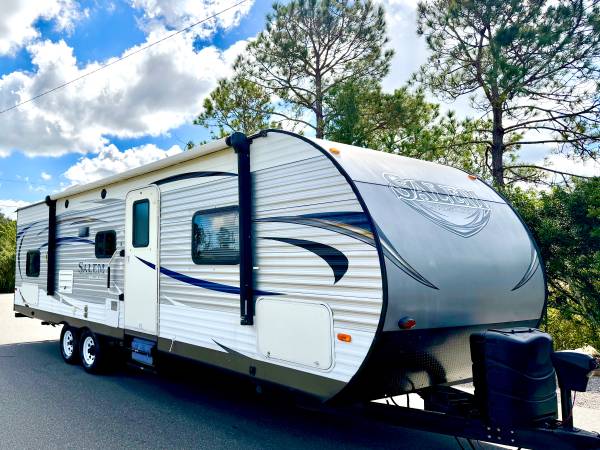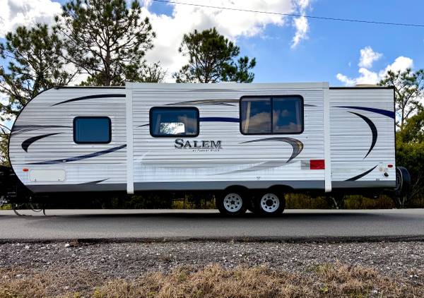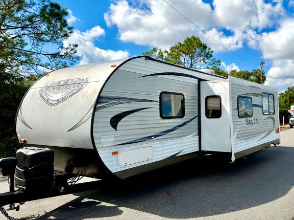 Hi up for sale we have a 2017 Salem by Forest River W/bunks. this unit is 30Ft long and weighs 6KLBS. It sleeps 10 comfortable with the private bedroom towards the front tip that has a queen size mattress and 360° rotating TV. The living area has a jackknife sofa with a U-shaped sleeper dinette. There is a set of bunks next to the private bathroom with tub/shower and sink. Kitchen has everything you need to live comfortable. Everything works all plumbing and appliances in working order. AC blows cold! No odors or leaks! The exterior is equipped with an electric awning (no rips or tears) an electric jack, electric stabilizers And comes with sway bars and hitch. This unit is ready to hit the road and it’s perfect for a large family looking to travel or live. Clean FL title in hand, serious inquiries only. READY to make a purchase cash only asking $11,500 if interested contact me at