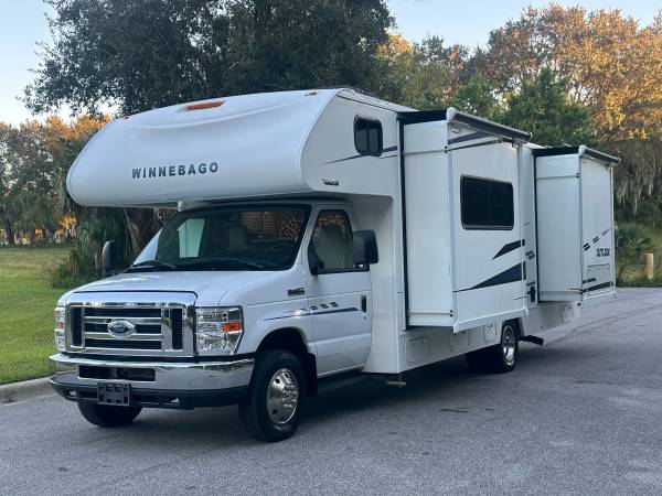 WOW!! Only 3865 miles on this 2019 Winnebago Outlook 27D Class C with 2 slide outs. This 1 Owner Coach is in great condition. Always stored under cover. Paint and decals look like new. Huge power patio awning with LED light strip. Plenty of storage. Onan 4000 generator. No delamination anywhere. The interior looks like new. Dinette booth seats 4 and converts to a bed. There is room for 2 to sleep in the overhead bunk. Fully equipped kitchen. Split bath with a large shower across from the toilet and sink. Rear bedroom has tons of storage space. Vanity counter and queen size walk around bed. This coach has never been smoked in and no pets. Just serviced and inspected. Please call Glenn with any questions at 4o7 2five7six5four7