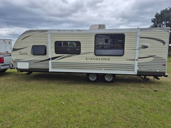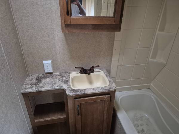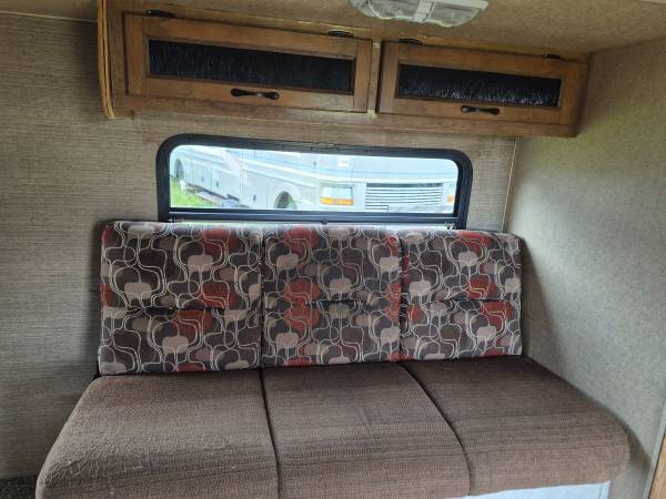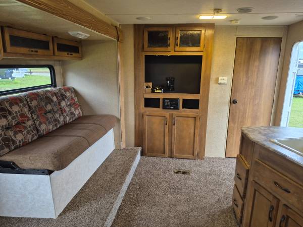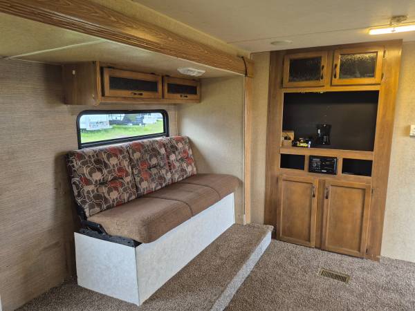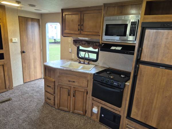 Has 3 bunks and front private bedroom full kitchen and bathroom big slide out