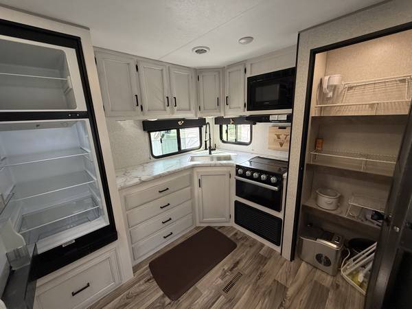 This travel trailer is equipped with all the amenities you need for a comfortable trip, including a fully equipped kitchen, 3 burner cooktop with a Furrion oven, a 10cu.ft double door refrigerator and griddle located in outside kitchen, a cozy living area with a convertible sofa for extra sleeping space, and a private master bedroom with a TV, queen-sized bed and storage underneath plus overhead storage and 2 full length closets with a shirt closet and 3 deep drawers. The bathroom includes a shower, sink, and toilet for added convenience. It has a 42" dinette with large storage under each bench, 70" sofa that sits across from the entertainment center with a 40" TV on swing arm with deep storage behind. We added spring rods for refrigerator, freezer, pantry and outside refrigerator to contain items during transit.