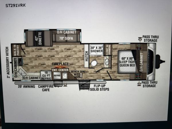 The VENTURE RV Sporttrek 291 VRK is built with quality materials and attention to detail, ensuring durability and longevity on the road. With a sturdy frame and aerodynamic design, this travel trailer is easy to tow and maneuver on the highway. The exterior features include a power awning, front window is automotive glass, outdoor speakers, outdoor shower with hot and cold water, solar panel, Sporttrek's Weather Shield which includes a radiant foil barrier, forced heat, enclosed underbelly, reflective PVC roof membrane and there is pass through storage compartment for all your gear.