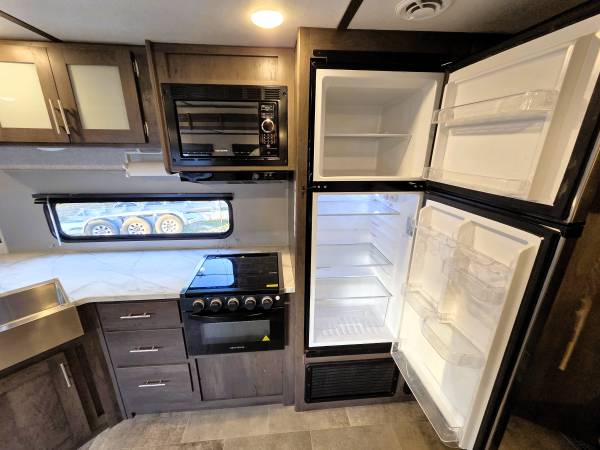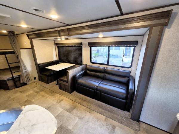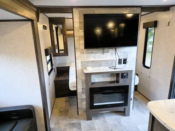 • Slide-out with a sofa and booth dinette. Some models include an electric fireplace.