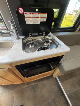 • Full kitchen: 2-burner propane stove, fridge, sink, and microwave