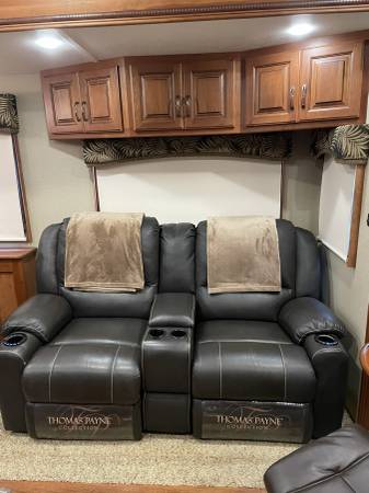 Comfort and convenience continue with two air-conditioning units, MCD window shades, a ceiling fan, medicine cabinet, and generous pass-through bay storage. The interior is paired with a freestanding dining table and chairs for flexible dining arrangements, and seating includes Thomas Payne theatre seating plus two recliners for ultimate relaxation after a day on the road. The floorplan measures 37 feet 11 inches in length, offering an open, airy atmosphere without sacrificing moving space or storage capacity.