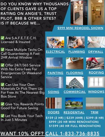 $999 (20-Hour Mini) / $1599 (40-Hour Remodel Special) Save thousands and renovate your kitchen, bathroom, basement, and more. You can even rewire, re-roof, re-side, repaint, re-pipe, or re-plumb, all for only $999 or $1599 labor. Visit https://www.rentatech.org/projects to learn more