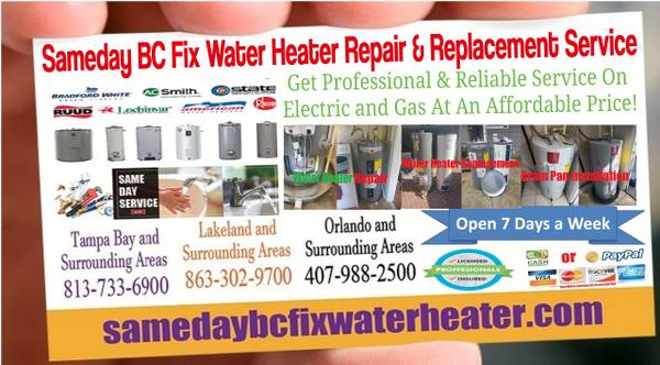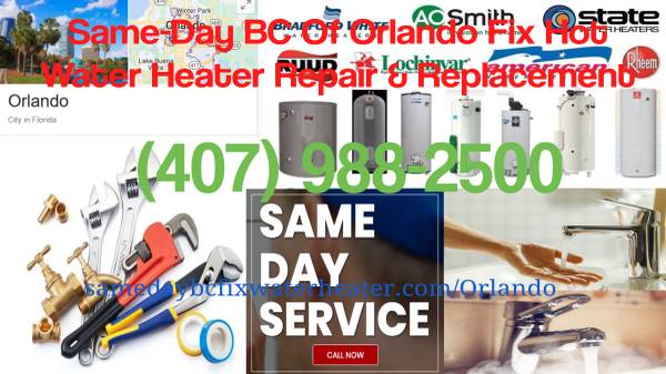 Same-Day BC Of Orlando Fix Hot Water Heater Repair Service, Replacement or drain, drip pan Installation Service cost company Near me Kissimmee, Clermont, Sanford. Give Us A call 407-988-2500 for faster service include how much does it cost to fix or installs electric water heater quote Now. Let our local Water Heater specialist technician repairman who fixing electric or gas tank or tankless hot water heater and help you get hot water again at an affordable price go to https://samedaybcfixwaterheater.com/orlando