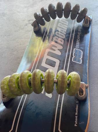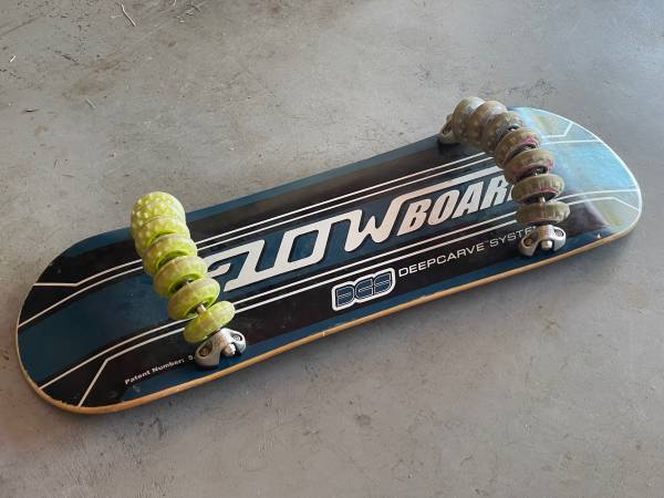 The Flowboard is a 14 wheel deep carve skateboard. There are 7 wheels on each arched truck that allows you to simulate a snowboard/surfboard.