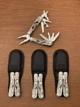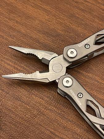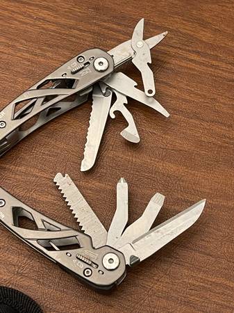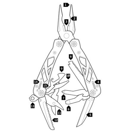 Gerber Suspension Multitool Knife Pliers 1 Spring loaded needle nose plier 2 Regular plier 3 Wire cutter 4 Tool lock 5 Plain edge blade 6 Large flathead 7 Cross driver 8 Saw 9 Can opener 10 Small...