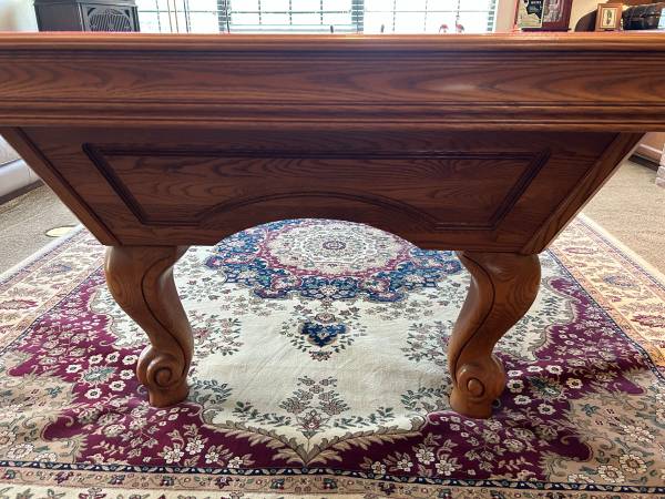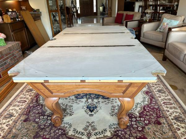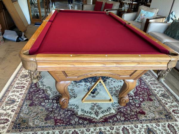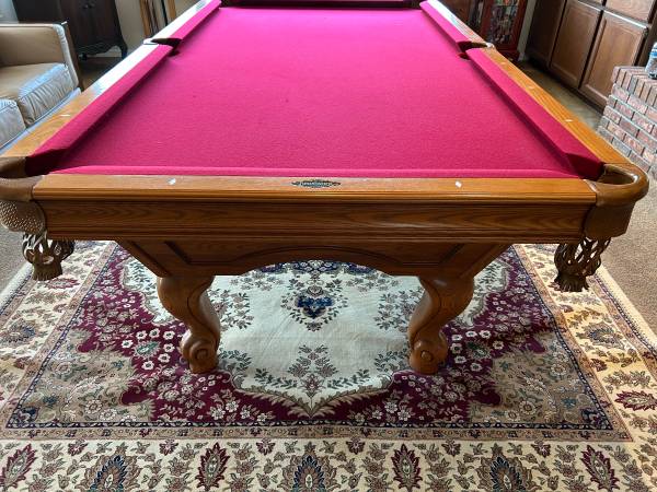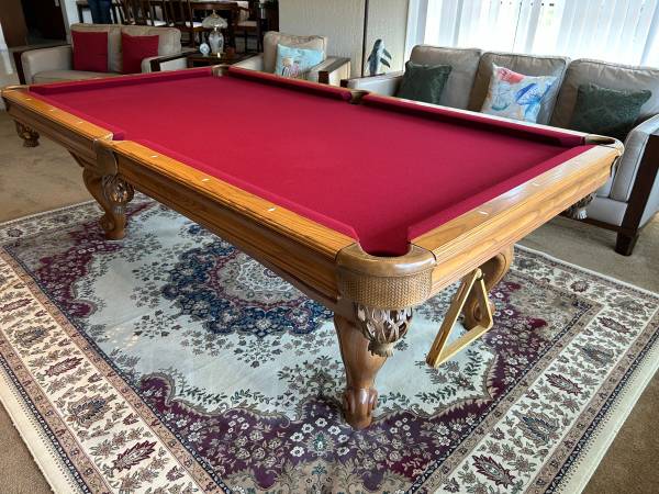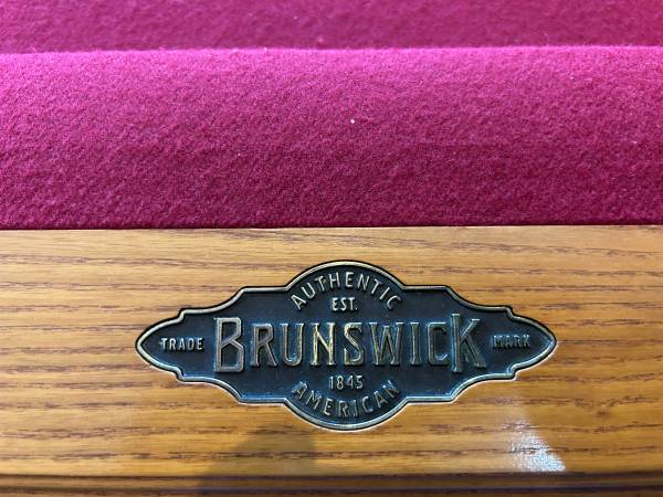 I have a standard 8-foot Brunswick Greenbriar II model. This is a one-inch slate table with leather drop pockets. This particular table is in excellent condition, there is barely a scratch on the table. The felt on the table is in very good condition but if you want a different color we can do that.
