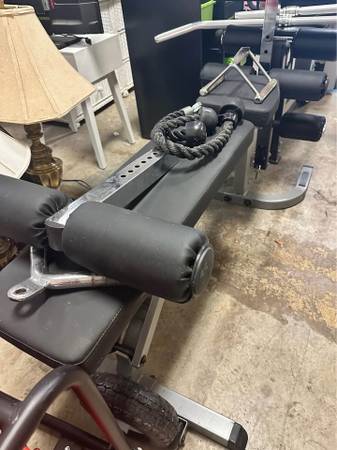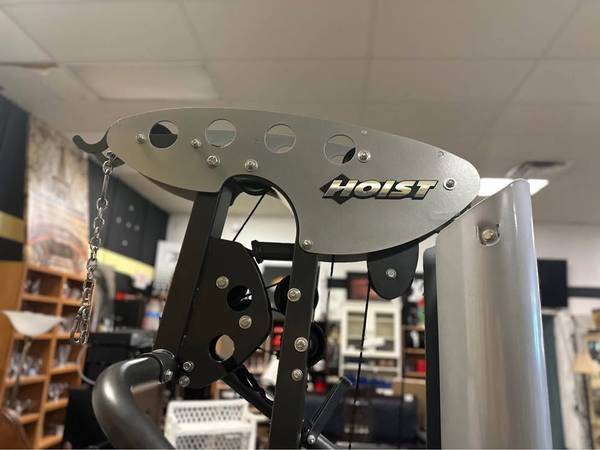 HOIST V3 Commercial grade home gym cable machine with 11 attachments and extra bench. Bench has added bicep, curl pad, and leg curl extension. All in one workout machine