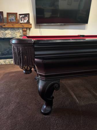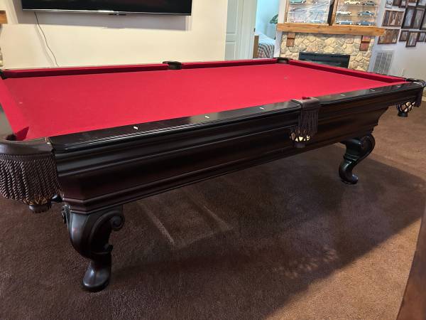 I have an awesome 8 ft. Olhausen "Seville" slate pool table for sale. This is a 3-piece, 1 inch slate table with leather drop pockets in EXCELLENT CONDITION! There is hardly a scratch on the rails, It is really in like new to excellent condition. New Andy speed cloth is also included, you can pick the color.