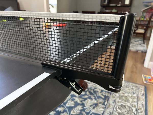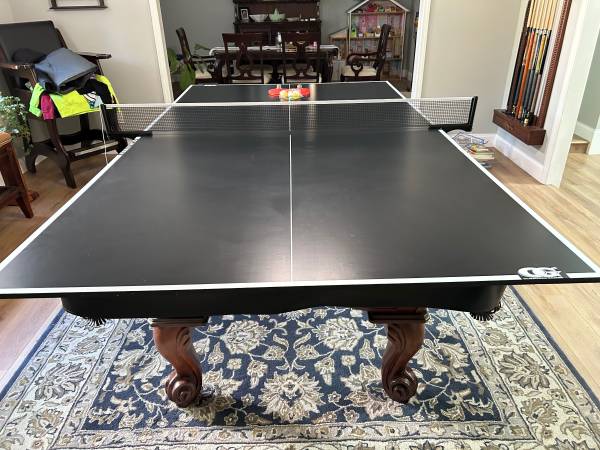 This is a regulation ping-pong top the dimensions are 5’ x 9’ two pieces. It’s the good one with the rubber backing on the pieces to protect your pool table.It comes with paddles, balls and net with brackets. These are the nice brackets that are easy to use. Look at the pictures and let me know if you’re interested.