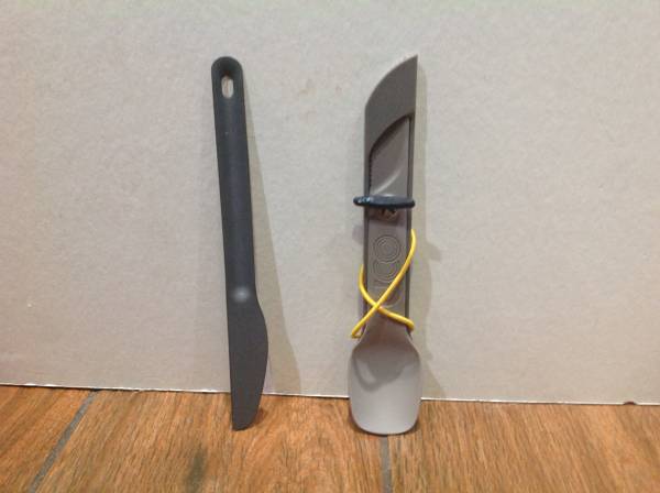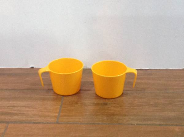 stainless steel tray plate $4 metal knife .50 cents stainless steel mug from the Ozark trail $2 2 cups yellow plastic by GSI Outdoors $2 camping pan with foldable handle by Coleman, 11.75" radius $5...