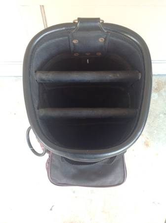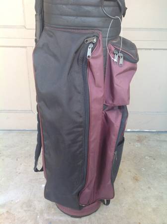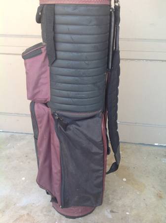 golf bag and clubs set by Wilson; Staff series, red wine and black bag, shoulder strap and towel ring, comes with top cover, 3 zipper pouches and 1 mesh pocket, some wear and rust