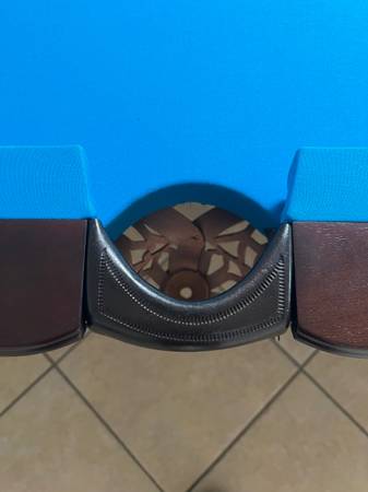 I have a really nice 7 ft. Brunswick “Allenton” pool table for sale. The play area is 38“ x 76“ which is slightly smaller than a standard 7 foot table. It is a 3 piece 1 inch slate bed table and features a beautiful espresso brown finish, tapered legs with routered grooves, diamond rail sights, and genuine leather drop pockets embossed with the Brunswick logo.