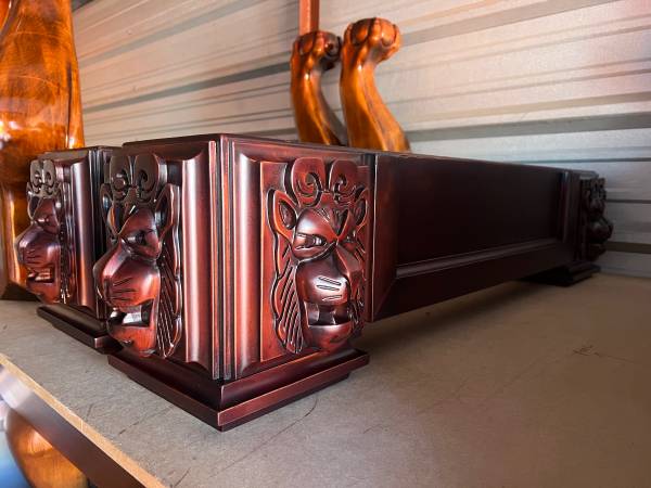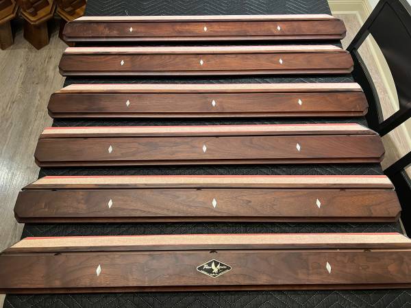 I have an extremely high end 8 ft. Pro Peter Vitalie “Lord Nelson” pool table for sale. This is a 3 piece 1 inch slate table with 46” X 92” play area, leather shield drop pockets and genuine mother of pearl diamond rail sights. It’s made of solid maple wood with a nice dark cherry finish. The most notable feature of the Lord Nelson model is the many lion heads around the frame. This model of Vitalie retailed for over $20,000. I took some pictures of the frame parts so you can see the wood tone of the table. I also took many pictures of the rails. The rails do not have a single scratch on them.