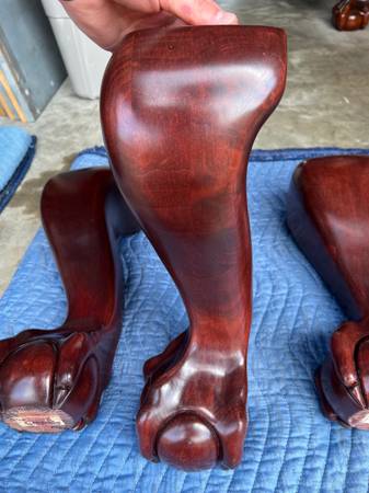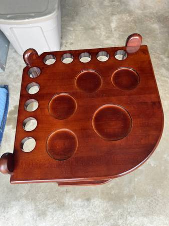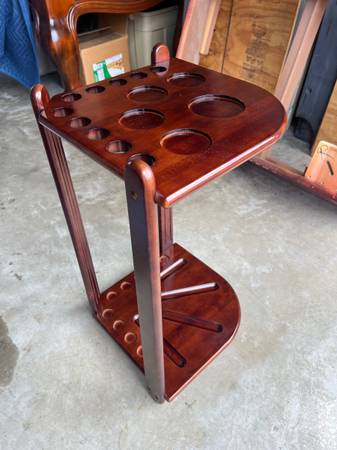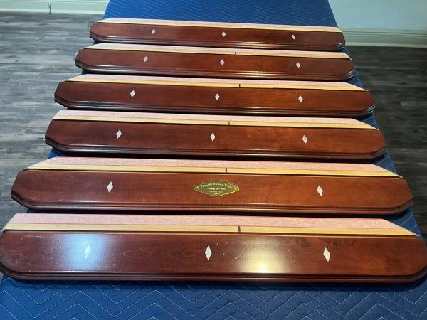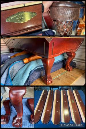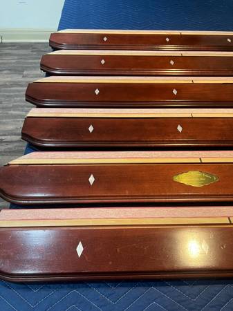 I included many pictures of the table including the frame with legs attached, six rails (with new Championship cushions), one pocket for reference, and the three pieces of 1 inch slate. I also have a matching corner cue rack available. The rack holds 10 cue sticks, a set of balls, and the circular indents in the top serve as cup holders.