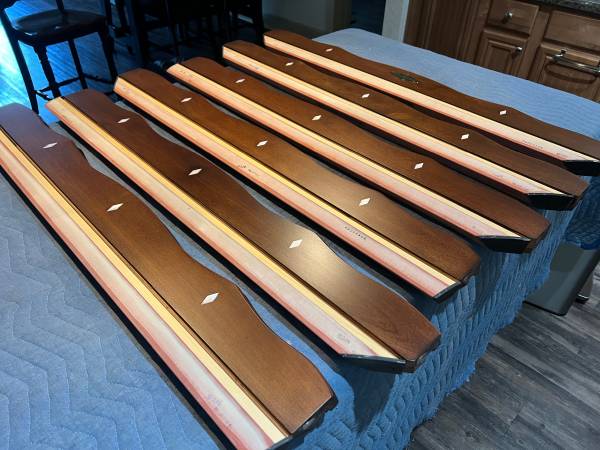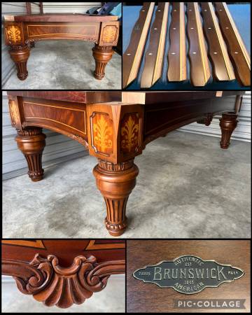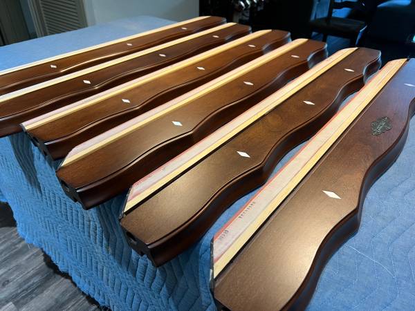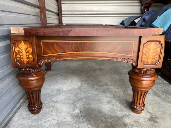 This is a like new 8 foot Brunswick “Barrington” pool table for sale. It is a 3 piece 1 inch diamond honed slate bed table with genuine leather drop pockets and mother of pearl diamond rail sites. This table hardly has a scratch on it. The rails are absolutely stunning. They are nice and thick and have a scalloped edge. I attached many pictures of just the rails laid out so you can truly appreciate them. The whole table features intricate inlays. I’ve been doing this business for over 15 years and I’ve never seen another Barrington model for sale. It is no longer made by Brunswick, making it a very rare table. The frame is built like a tank. The sides of the frame are 5 inches thick. Everything is solid wood.