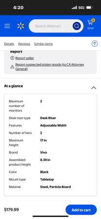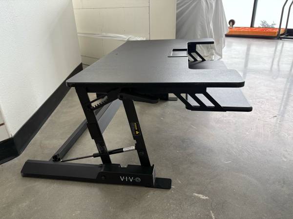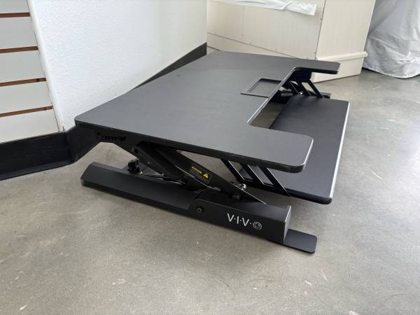 Adjustable up to 17” high. From sit to stand. 2 tiers that can hold 2 screens 36” wide. OBO