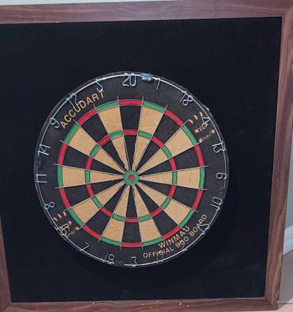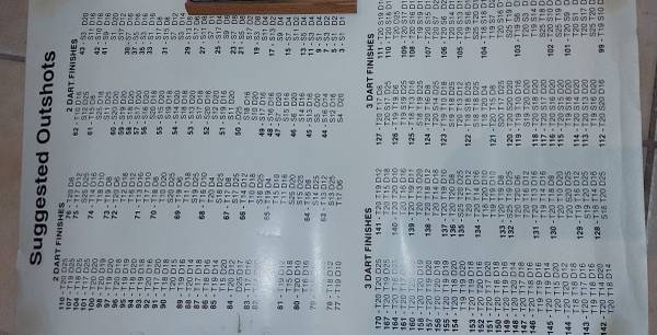1.5-inch-thick bristle dart board, made in England. Black cloth backer board to catch errant throws Dry Eraser Cricket score board. poster for suggested outshots when playing cricket.