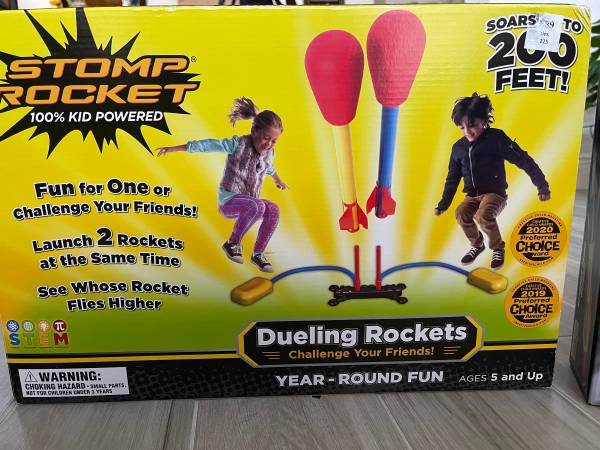 Stomp Rockets Dueling Rockets. This set is new and has never been out of the box. It includes a double launcher and 4 rockets. The second set comes with a single launcher and 5 rockets. It is a...