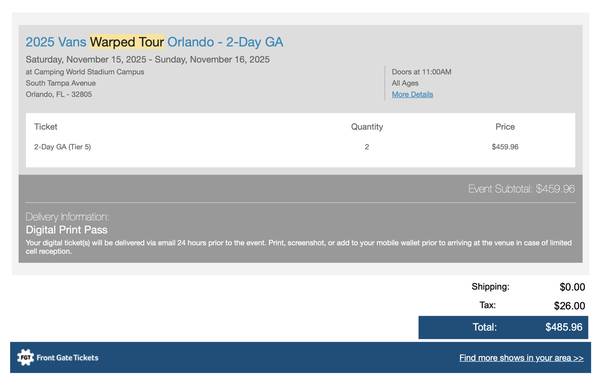Two tickets for 2-day Warped Tour Orlando, general admission ($243 each ticket).