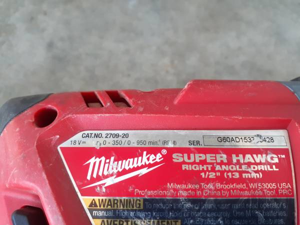 Milwaukee 2709-20 Fuel M18 cordless Super Hawg 1/2" right angle drill. Tool Only. Brushless motor. 18-volts. Excellent condition. $175.