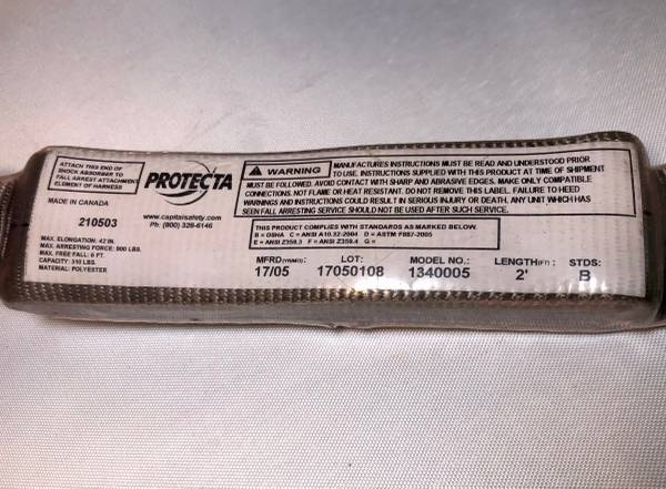 Protecta PRO Rope Adjustor - Shock Absorbing Lanyard For 5/8” Rope Length 2' ft STDS: B Model No: 1340005 Max Elongation: 42 IN Max Arresting Force: 900 LBS Max Free Fall: 6 FT Capacity: 310 LBS...
