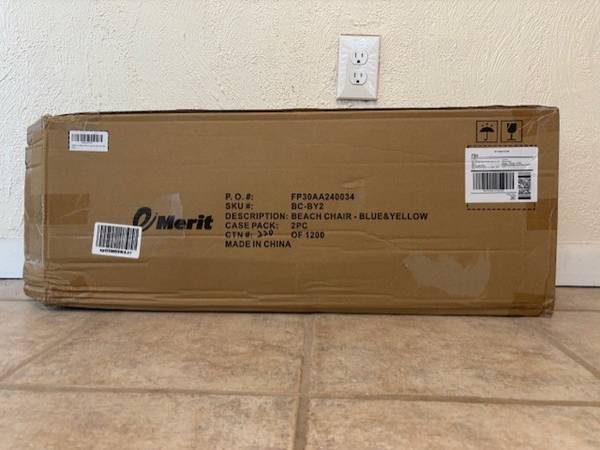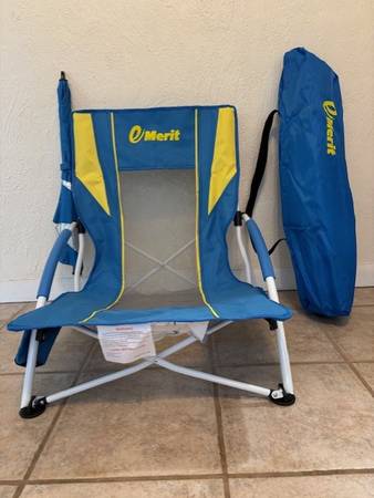 PRICE REDUCED! Emerit Low Beach Chairs for Adults. 2-pack set. Sling beach chairs with umbrellas. Folding backpack camping chair with cup holder. Blue and yellow design. Arm pads on metal arms. Made of breathable cooling mesh fabric. Splicing section is tear-resistant, quick-drying, easy-to-clean oxford cloth. Chair maximum weight 250 lbs.