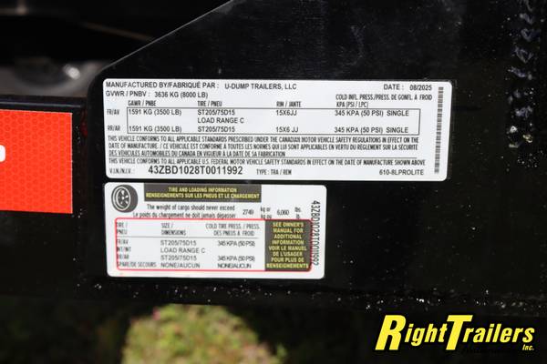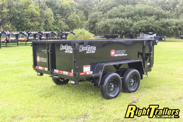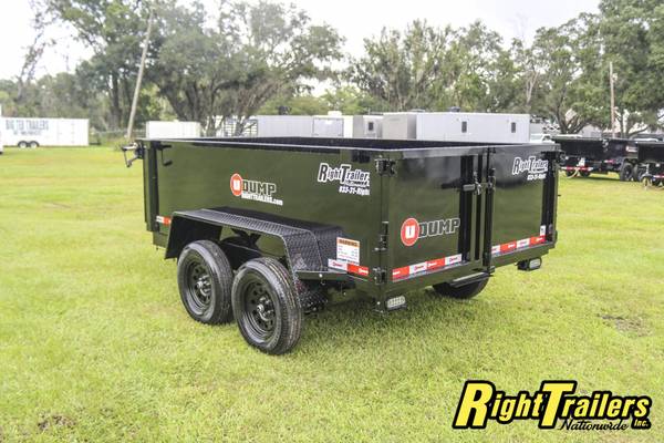 6x10 U-Dump 8,000 GVWR, welded a-frame tongue, tongue jack, C-channel tongue (heavy duty), single hydraulic cylinder lift, 31" tall 12GA. Sides and Floor, tandem 3500 lb brake axles, 15" RADIAL tires and wheels, all DOT approved lighting, LOW RIDER, SPARE MOUNT, TARP INCLUDED!!!