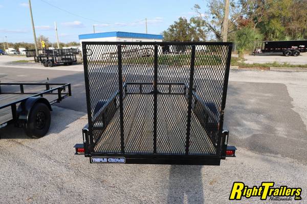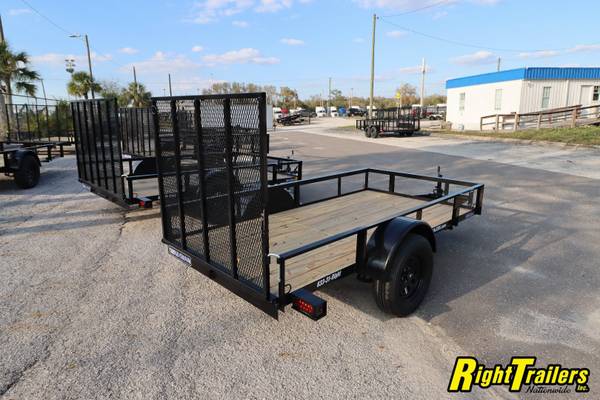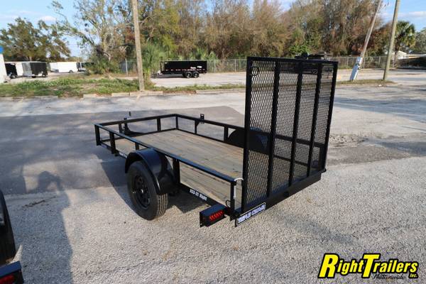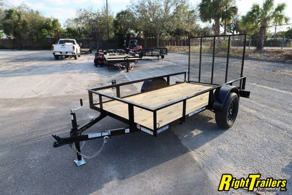 5X10 UTILITY TRAILER, All steel frame construction, welded a-frame tongue, tongue jack, C-channel tongue (heavy duty), 2" coupler, 14" tall side rails, (4) tie down loops, pressure treated 2x8 wood deck, 15" tires and wheels, tubular uprights in rear ramp, heavy duty mesh on ramp, all DOT approved lighting, POWDER COATED FRAME (long paint life), LED lights, radial tires, spare mount