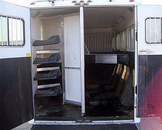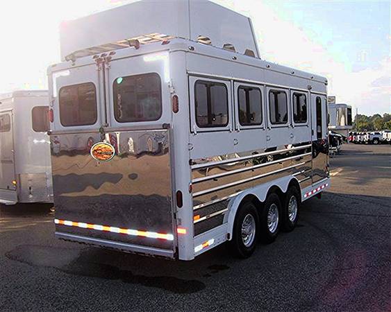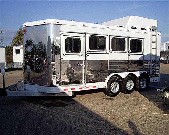2009 Sundowner 725 Series all-aluminum 4 horse bumper pull trailer, 8′ wide and 7′6″ tall. mangers, hay rack, electric jack, rear ramp, rear tack, and triple axles for added stability. The fully lined and insulated interior features a boot box, hat rack, blanket bar, bridle hooks, drop windows on both the head and butt sides, and aluminum face bars.