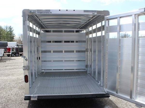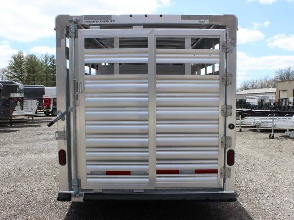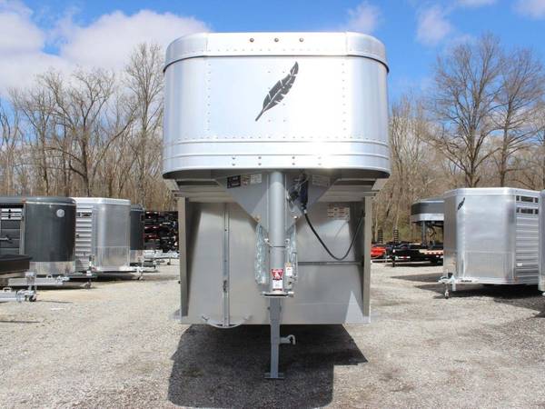 2022 Featherlite 8117-6724 is a 24-foot aluminum gooseneck livestock trailer. Width is about 6'7" and interior height is 6'6". It runs on two 7k torsion axles with electric brakes and ST235/80R16 LRE tires. A spare tire carrier is mounted up front.