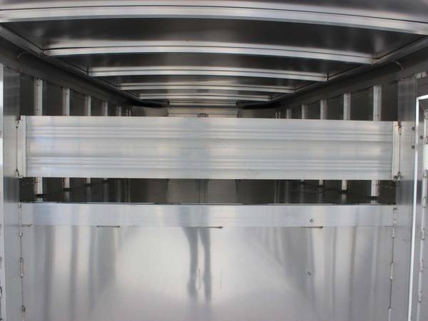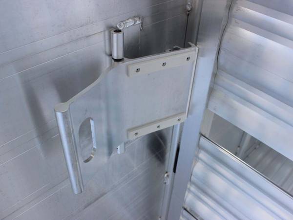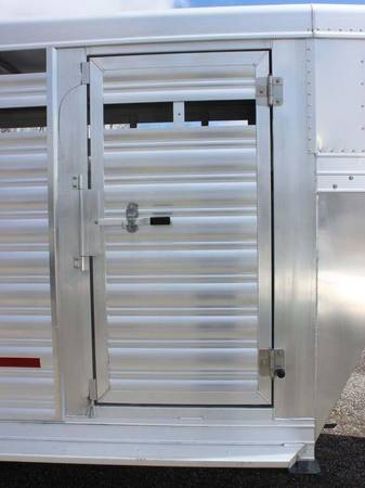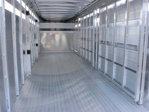 The trailer has a rear full swing gate with an outside slider and a slam catch. Two center divider gates with slam latches are inside. An escape door is on the side, and a removable drop-gate panel is included. The floor is skid-resistant extruded aluminum. The nose is tapered, and DOT tape and a rubber dock bumper are installed.