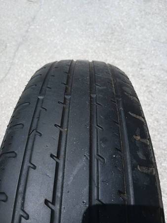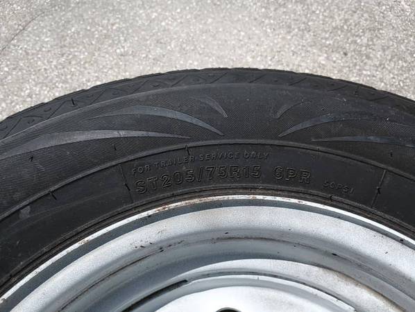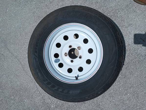 Listed here is a USED 5 Lug Painted Wheel and Tire asking $60. Size is ST205/75R15. Tire has a load range C rating. Tire has plug repairs but holds air fine. Tread is moderately worn but shows no dry rot. Will make a great spare or use for something with light loads. Tire is a Taskmaster brand Model TTT668. This rim and tire came from a trailer I no longer have. If you have any questions please feel free to contact me and I will help you to the best of my abilities. show contact info