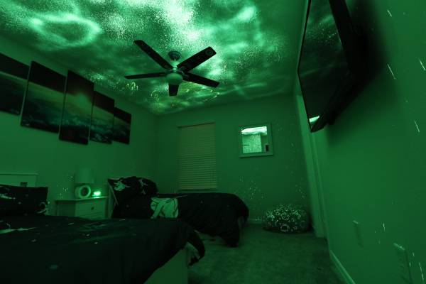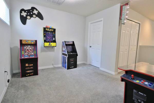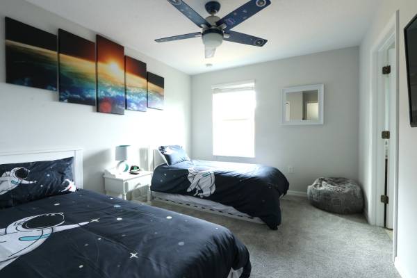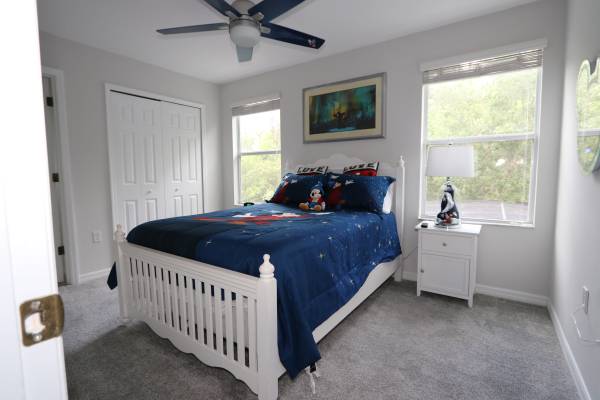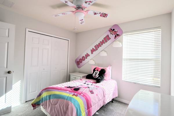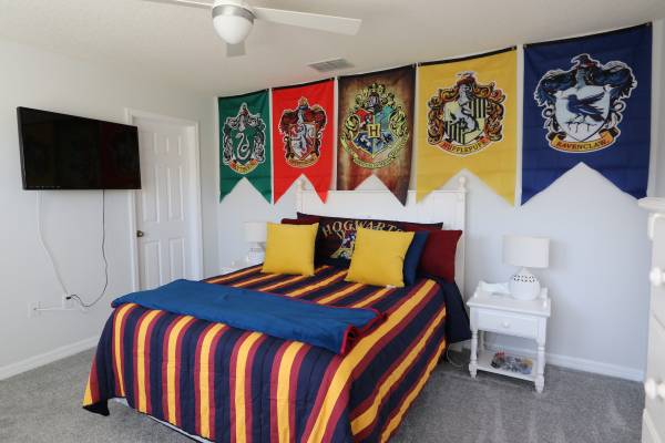 There are three master king bedrooms, each with ensuite bathrooms. There is one room taking you to Hogwarts. A queen room with Mickey in Fantasia and a full room featuring Minnie Mouse. A further bedroom with two twin beds (plus 1 trundle) blasts off to outer space, featuring special light effect around the room. Overall, there are 5 bathrooms, plus a half bath downstairs.