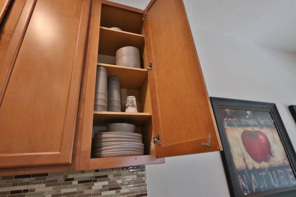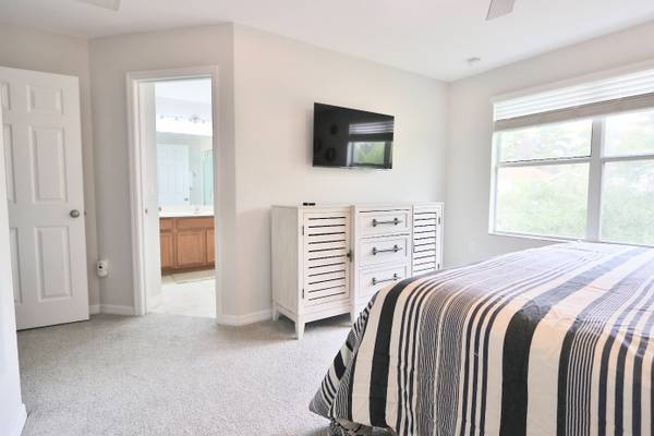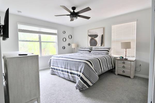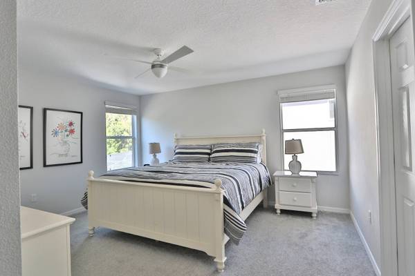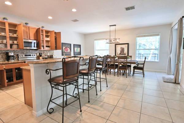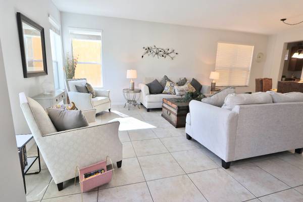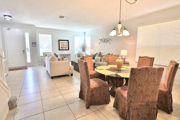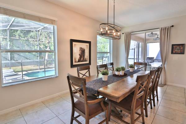 The home has two living areas offering plenty of space to spread out and relax. The bright front living area as you enter has comfortable sofas, plus a breakfast area table and chairs. Settle in the rear living room with large TV and watch a movie together. The space also has large patio doors leading to the pool deck.