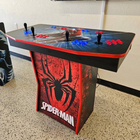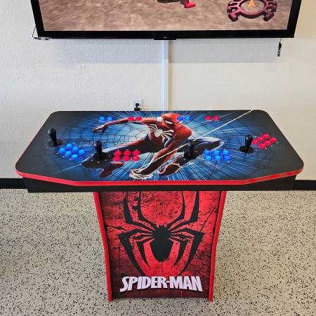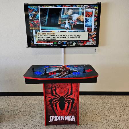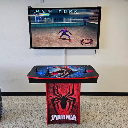 4 Player Spiderman pedestal arcade machine. Fully wrapped with LED buttons. Plays over 6000 games, no downloads required. Plug and play into any size TV via HDMI port. TV NOT INCLUDED.