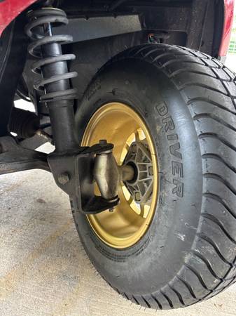 Set of 4 gold cart wheels and tires. 205/65/10 Wheels are in excellent condition and tires are good. 2 tires are 90% and 2 are about 35% $275 352- four three four -4480