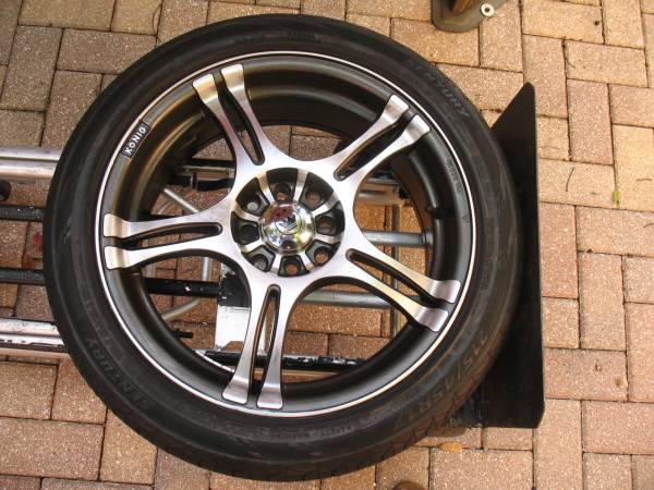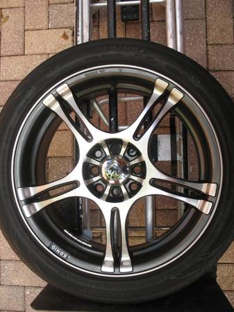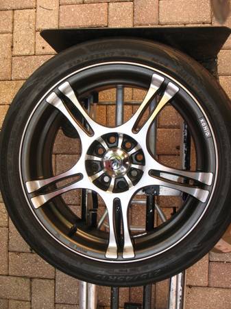 17 inch x 7 inch spoke wheels with a 4 x 100 bolt pattern with center caps. comes with tires 215/45r17. 2 tires are good and the other 2 have a little life left in them. the good news is these sentury tires only cost $63 each. Tread depth on each tire is as follows; 8 1/2/32nds, 6 1/2/32nds, 6/32nds, 5/32nds.